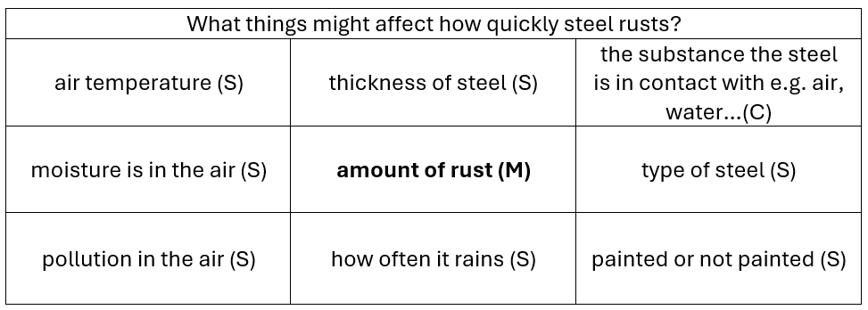 Model how to use the variables grid to plan a fair test by only changing one variable and keeping all others the same. For example, if they investigate the effect of different substances on the rate of rusting, students might: