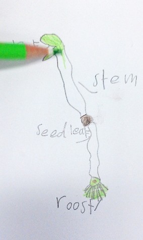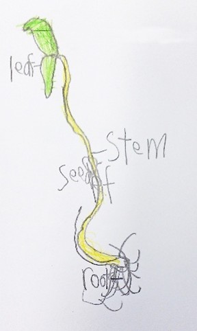 After the demonstration, the students were shown a photograph of a different plant (a sunflower seedling germinated in class) and asked to ‘draw this plant like a scientist’. Their illustrations (with a label added as a second step) are shown in Figure 3. Colouring is not required in scientific drawings, but in this class, the students were quick to grab their pencils!